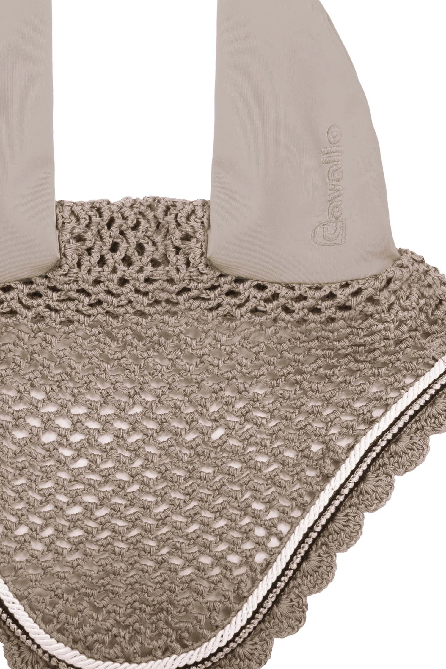 Fliegenohren aus schnelltrocknendem, hautfreundlichem Funktionsjersey im Ohrenbereich. Das linke Ohr ist mit dem Cavallo Schriftzug bestickt. Kopfbereich in Häkeloptik. Einfassung durch formbeständige Kordel in Weiß und einem schwarzen Band mit goldenen, schimmernden Fäden.