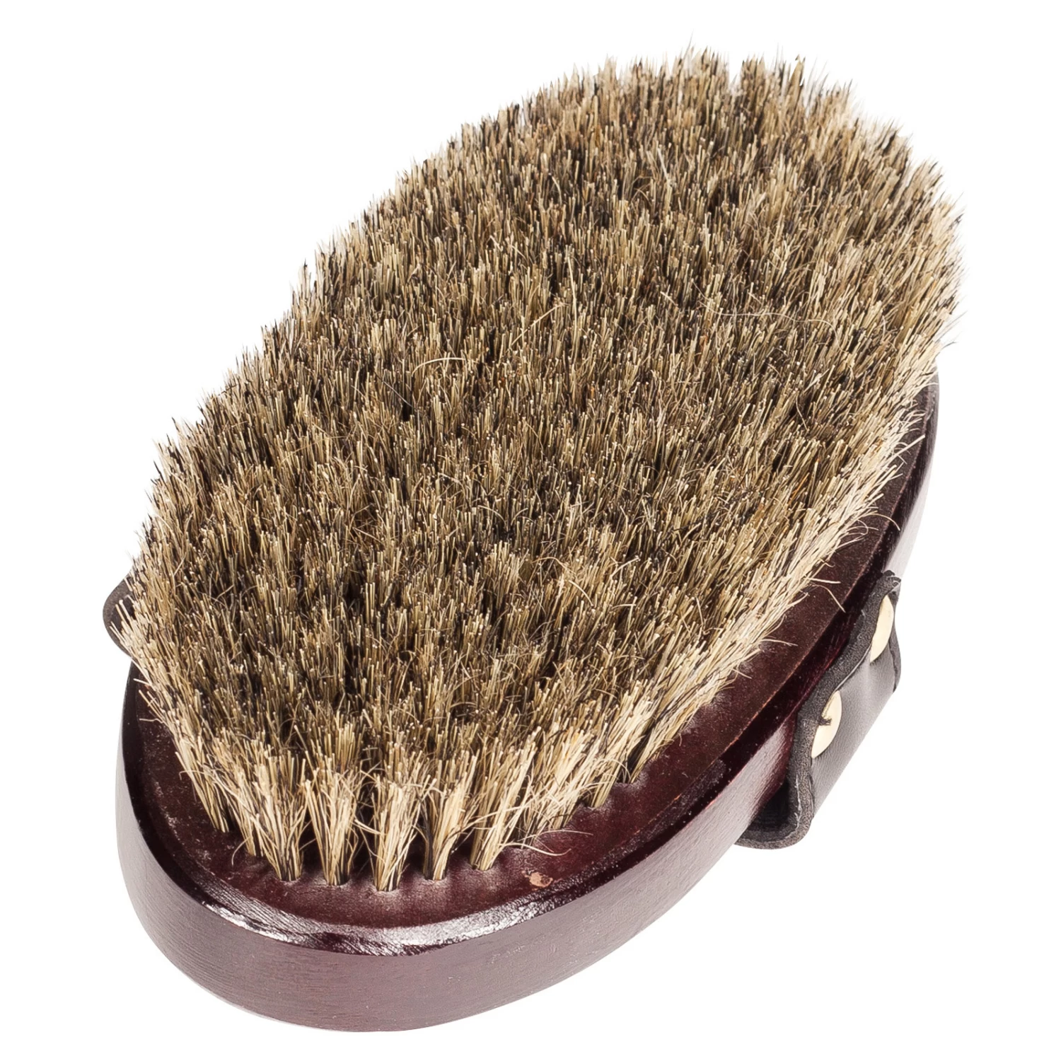 Materialien: Verschiedene Schweineborsten, Holzrücken, Lederschlaufe. Größe 185 x 85mm.