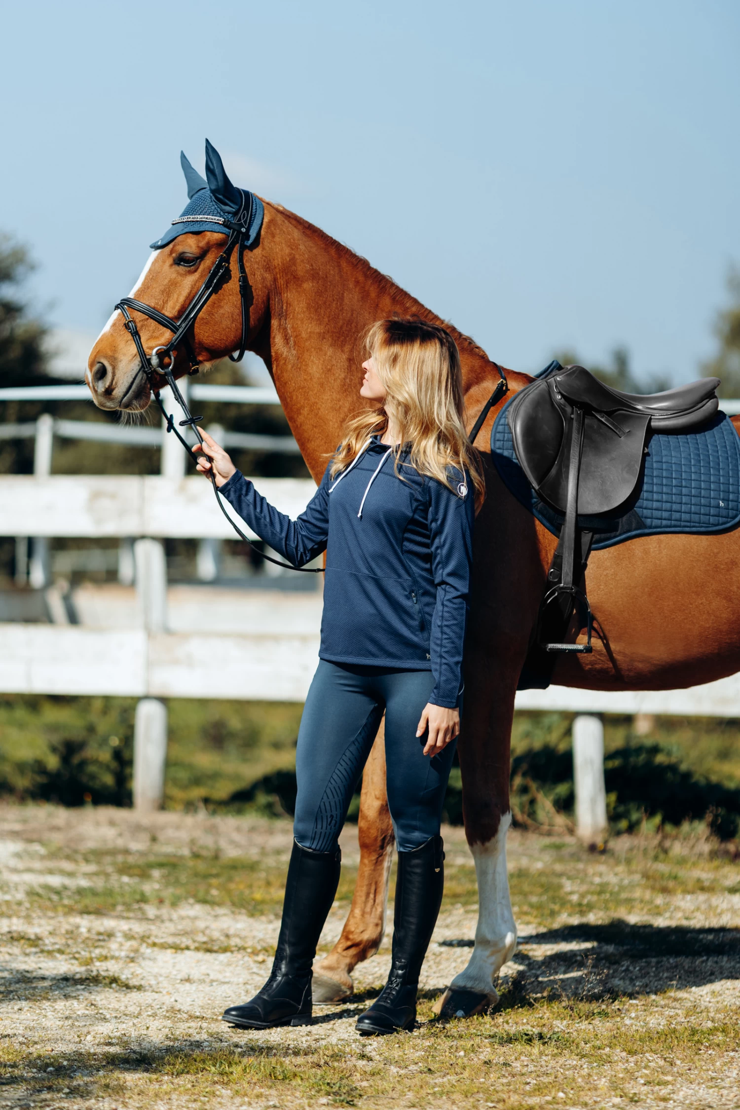 Unsere kühlende Horze Fliegenhaube schützt dein Pferd mit komfortablem Netzmaterial vor Überhitzung. Das Metallic-Logo ist ein subtiles Detail. Kombinierbar mit der kühlenden Schabracke (erhältlich im Dressur- und Vielseitigkeitsschnitt) für den kompletten Look.