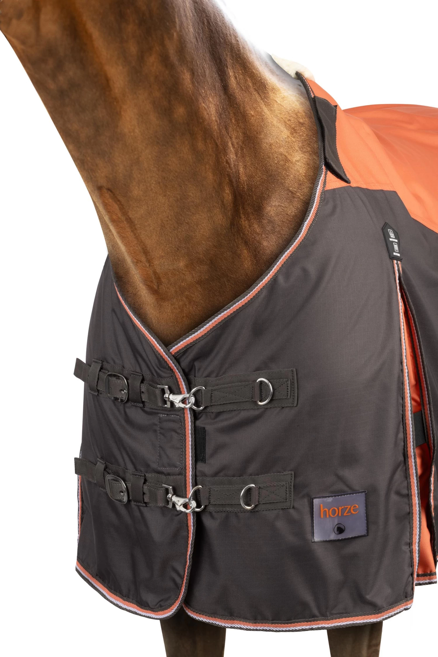 Unsere Horze Lucerne Regendecke hält dein Pferd trocken und das weiche Fleecefutter ist warm und bequem. Elastik hält die Decke an ihrem Platz und sorgt für die perfekte Passform. Doppelte Frontschnallen und Kreuzgurte schließen sicher. Ein Halsteil kann am Klettverschluss angebracht werden. Das sportliche Design lässt sich leicht in deine Reitausrüstung integrieren.
