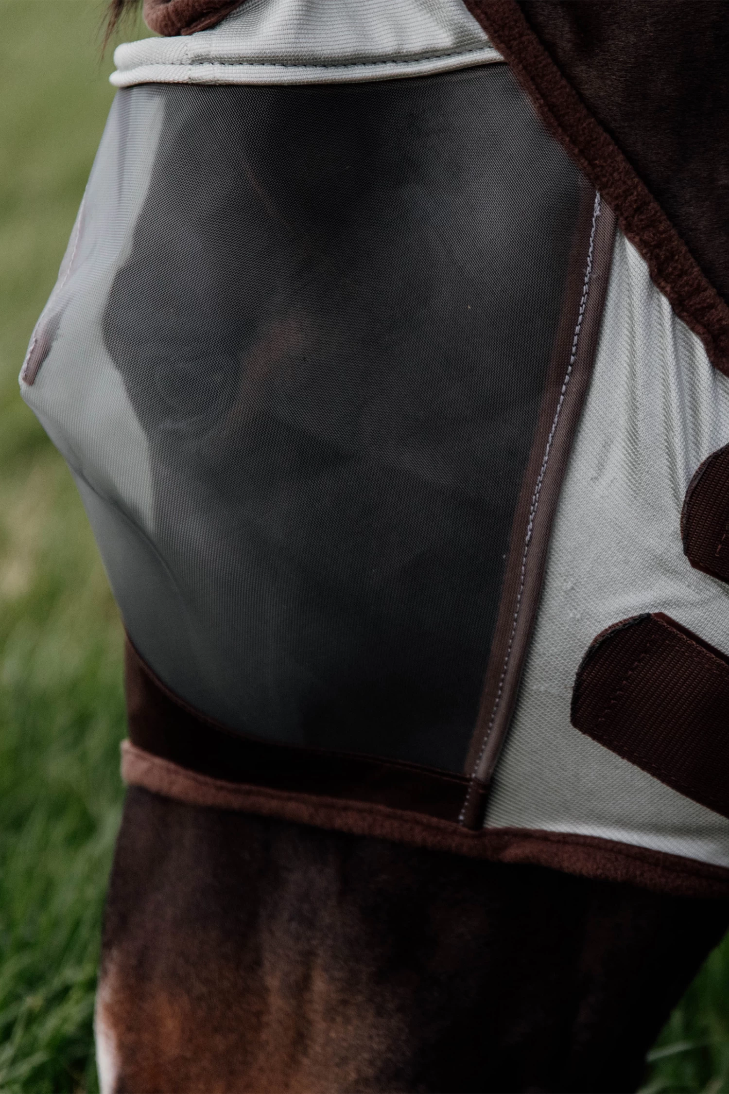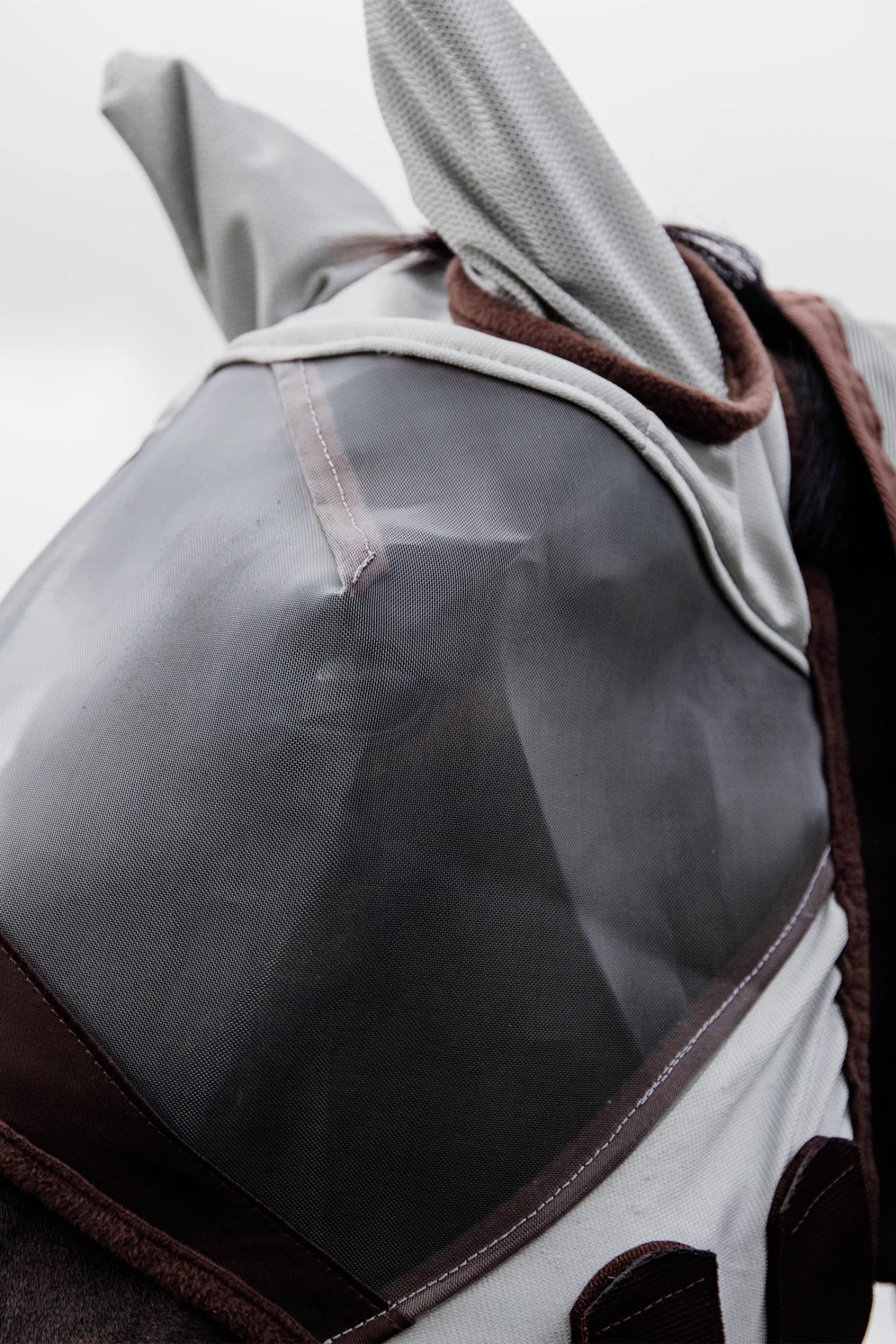 Die Maske besteht aus starkem Netzgewebe mit UV-Schutz und Lycra, was das Eindringen von Insekten verhindert. Aufgrund der Kunststoffformen vor der Stirn berührt die Maske die Augen des Pferdes nicht und bewegt sich immer in ihre ursprüngliche Form zurück. Die Maske kann mit einem Reißverschluss und einem Druckknopf geschlossen werden. Um die Maske zu waschen, lege sie einfach bei 30 Grad in die Waschmaschine.
