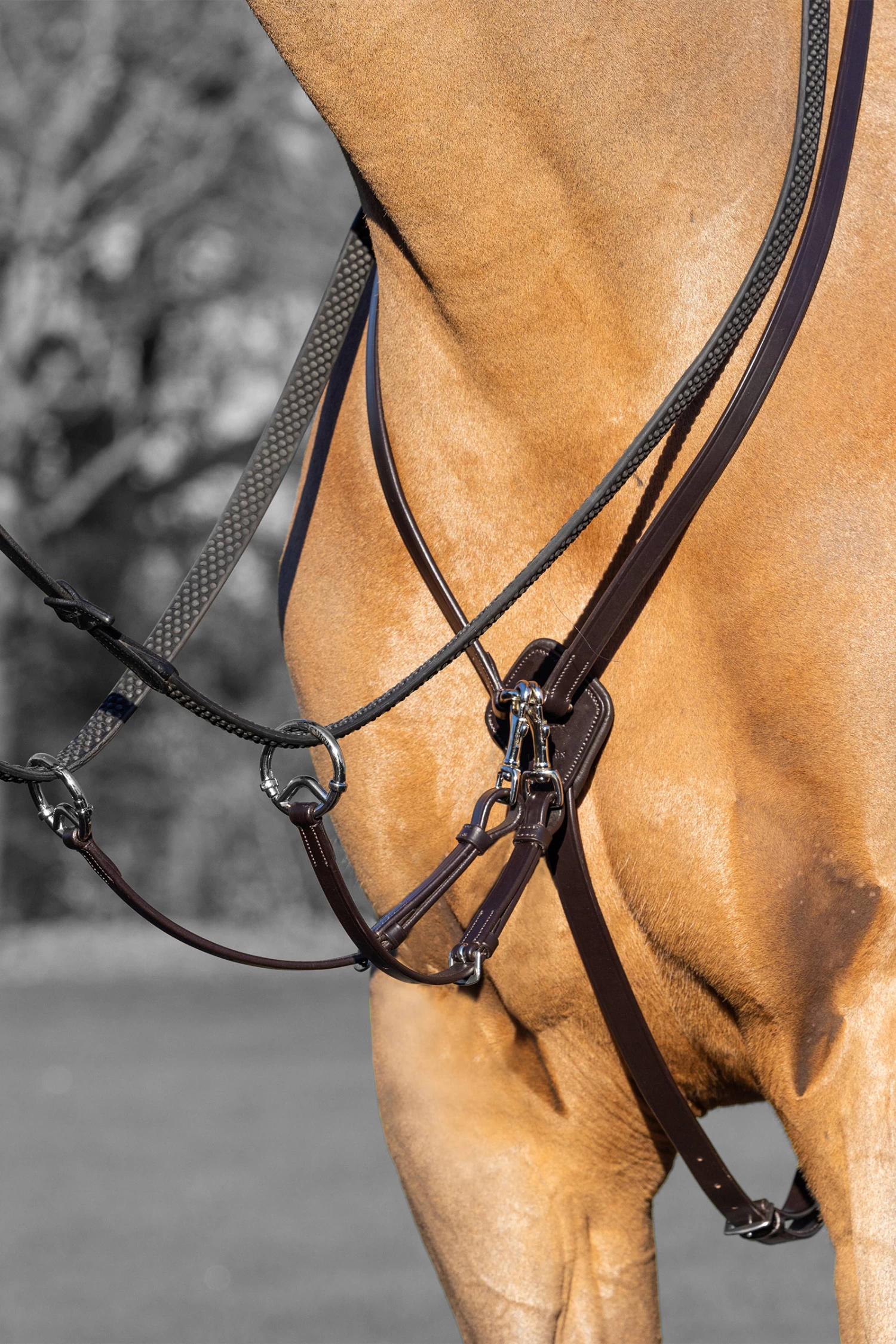 Die speziell entworfenen Martingalringe lassen sich schnell und einfach an- und abschnallen, ohne dass du die Zügel öffnen musst. Die abnehmbaren Zügelbefestigungen können entfernt werden, wenn sie nicht benötigt werden.