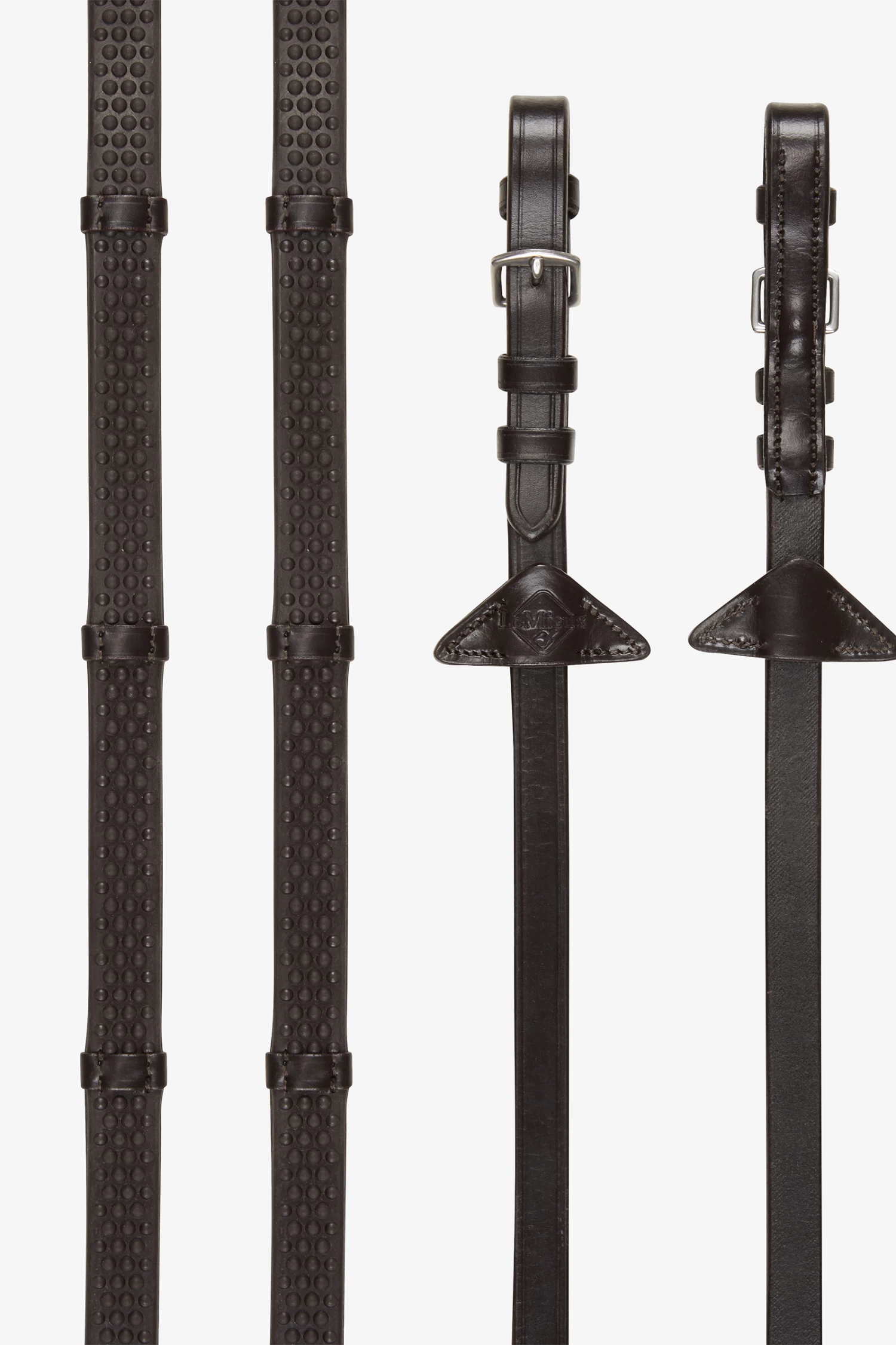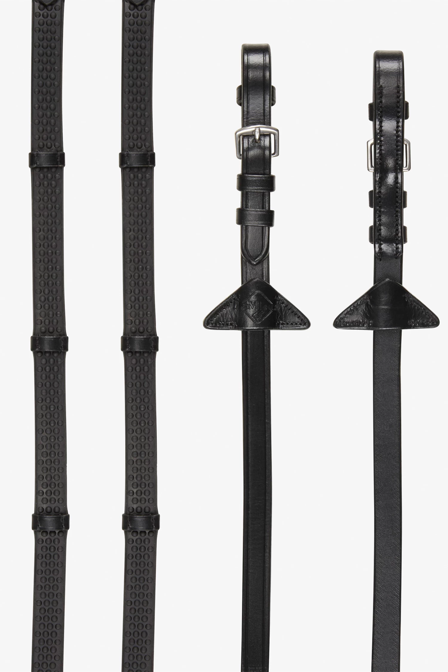 Die Eventa Gummizügel sind schön weich und flexibel und liegen leicht in der Hand des Reiters. Die Nyloneinlage verhindert ein Ausdehnen, während die Lederstopper für zusätzlichen Grip und gleichmäßige Zügelführung sorgen.